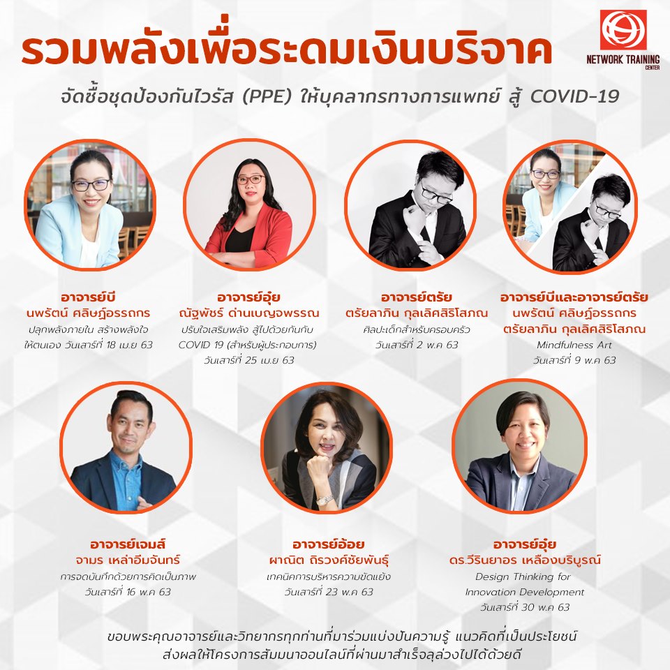 ด้วยเหตุนี้ NTC ในฐานะสถาบันฝึกอบรมเล็งเห็นถึงความสำคัญของปัญหาดังกล่าว จึงได้จัดทำโครงการสัมมนาออนไลน์ขึ้นในทุกวันเสาร์ของเดือนเมษายน - พฤษภาคม 2563 เพื่อระดมเงินบริจาคจัดซื้อชุดป้องกันไวรัส (PPE) จำนวน 200 ชุด เพื่อบริจาคให้กับบุคลากรทางการแพทย์ของโรงพยาบาลศิริราช